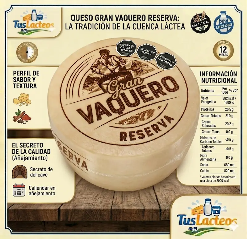 El Queso Gran Vaquero es un queso duro de tipo parmesano, añejo (mínimo 12 meses de maduración), conocido por su textura firme, compacta y granulosa, que revela cristales de tirosina, característicos de quesos de alta calidad. Posee un sabor y aroma intensos, desarrollados y únicos, ideales para rallar, gratinar o disfrutar solo como aperitivo, ofreciendo una experiencia sensorial rica y profunda, con notas de sabor complejas y un bouquet aromático que lo hacen destacar.
