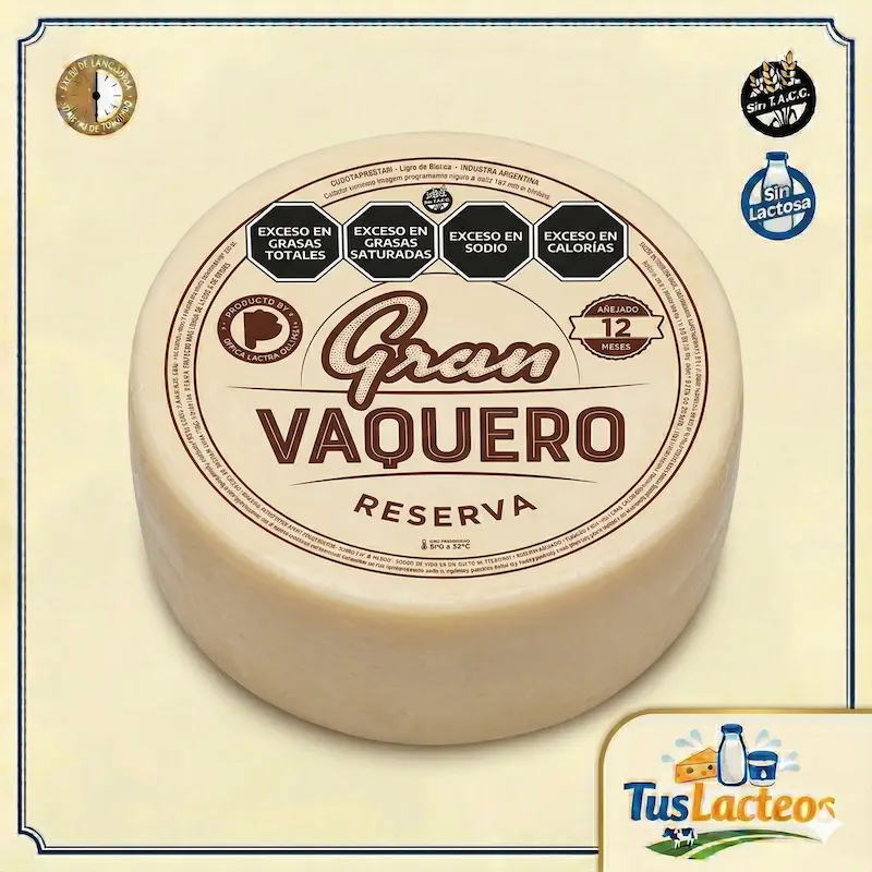 El Queso Gran Vaquero es un queso duro de tipo parmesano, añejo (mínimo 12 meses de maduración), conocido por su textura firme, compacta y granulosa, que revela cristales de tirosina, característicos de quesos de alta calidad. Posee un sabor y aroma intensos, desarrollados y únicos, ideales para rallar, gratinar o disfrutar solo como aperitivo, ofreciendo una experiencia sensorial rica y profunda, con notas de sabor complejas y un bouquet aromático que lo hacen destacar.