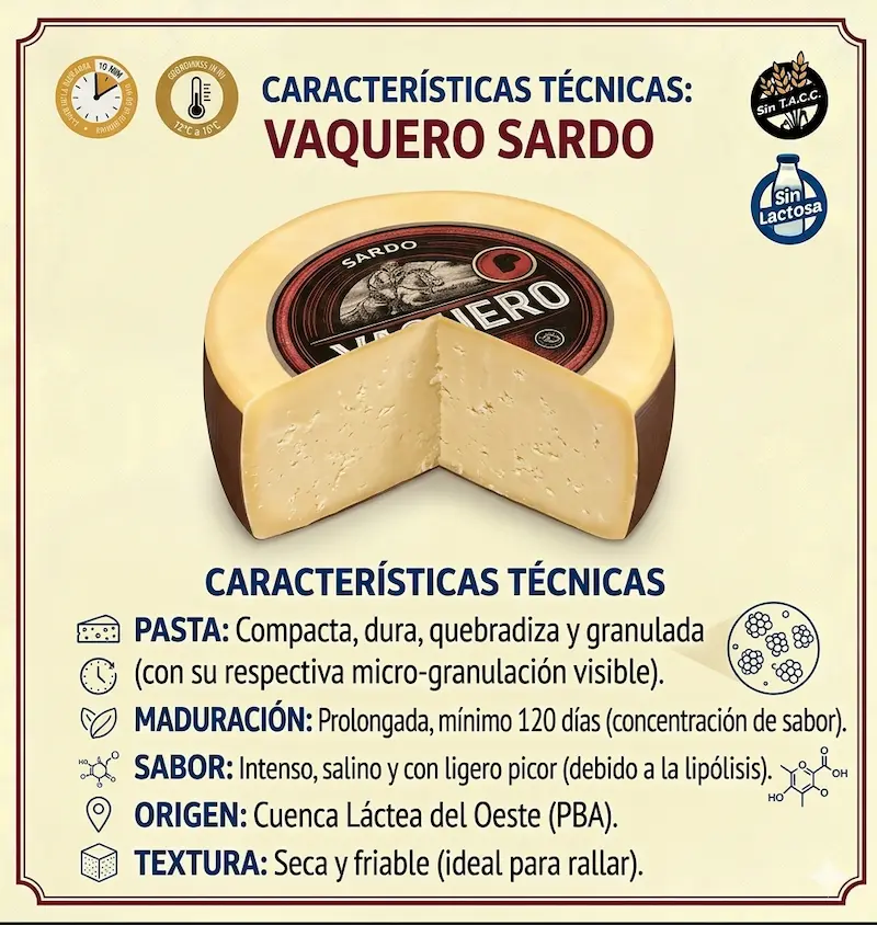 Queso de pasta dura, compacta y firme, de sabor intenso y aroma característico, levemente picante. Ideal para rallar y realzar el sabor de tus comidas o como complemento de picadas.